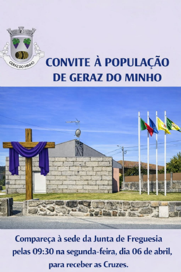 A Junta de Freguesia de Geraz do Minho convida a todos os Gerazianos para comparecer na sede, pelas 09:30, segunda-feira dia 06 de abril para a receção das cruzes.